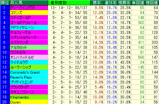 - 馬券のヒント: 芝では、圧倒的に短距離が主戦場と言えます。芝の短距離戦に出走してきたデクラレーションオブウォー産駒は、まず警戒が必要です。スプリント能力に長けた産駒が多く、狙いどころが非常に明確です。