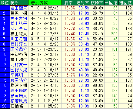 - 17番: 複勝率27.3% (平均よりかなり高い)、単勝回収値74 (平均より高い)、複勝回収値53 (平均より低い)