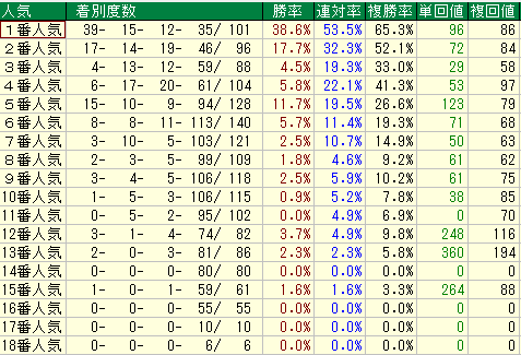 - 18番: 複勝率9.1% (平均よりかなり低い)、単勝回収値0 (平均より低い)、複勝回収値10 (平均よりかなり低い)