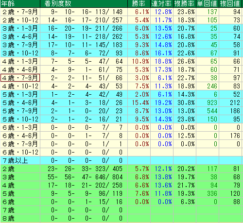 - 「4歳まで」がピーク! 早期の活躍馬を積極的に狙いましょう。5歳以降は割引が必要です。
