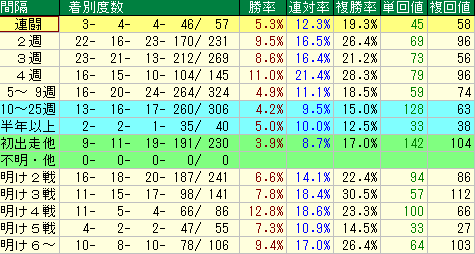 - 明け5戦目:疲労蓄積か?好走率は低下傾向