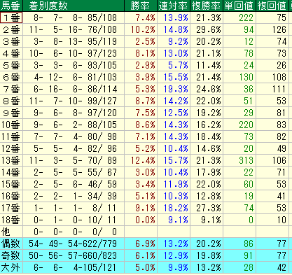 - 奇数番: 複勝率19.8%、単勝回収値91、複勝回収値77