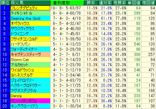 - 種牡馬データ:複勝率21.6%(平均より低い)、単勝回収値32、複勝回収値81