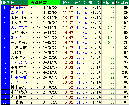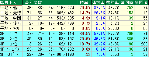 2番が突出して得意であるものの、1番、3番、4番は平均よりも複勝率が低く、回収値も振るいません。内番全体としては、平均よりやや苦手と言えます。