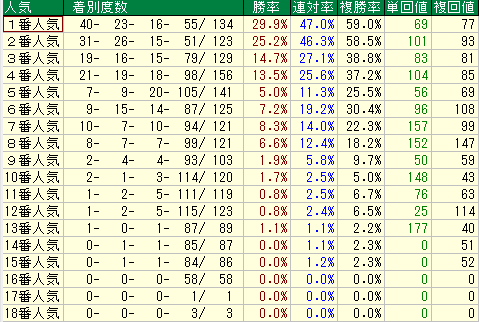 - 平均データ:複勝率22.2%、単勝回収値66、複勝回収値68