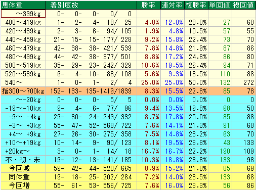 - ① 体重別で比べてみてどの馬体重が一番成績が良いか悪いか