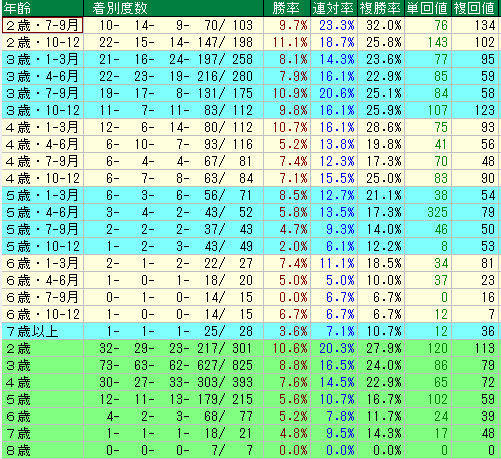 勝率5.8%、複勝率**17.3%**と低いものの、単勝回収値325という驚異的な数字を叩き出しています。これは人気薄での激走があったことを示唆しており、この時期の5歳馬は、大穴候補として警戒すべき存在と言えるでしょう。ただし、再現性には疑問符がつくため、過度な期待は禁物です。 - 5歳以降は基本的に回収率も低い:
