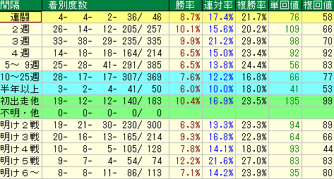 複勝率**27.0%**と高く、その期の5戦目の馬は好走が期待できます。 - 「連闘」や「2週」の間隔は単勝で妙味あり: