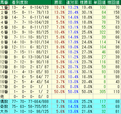 - 14番:複勝率30.1%(平均より高い)単勝回収値93、複勝回収値109と高い。非常に得意。
