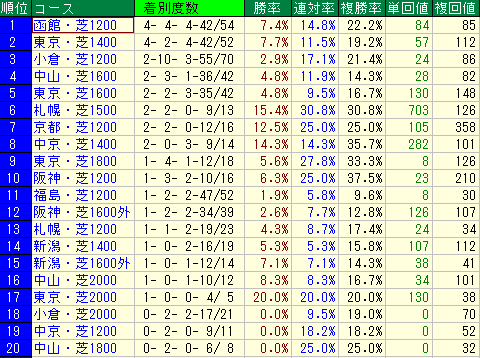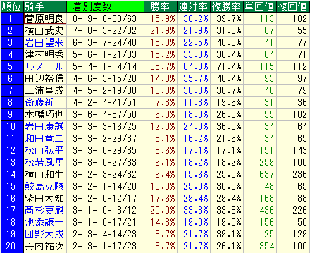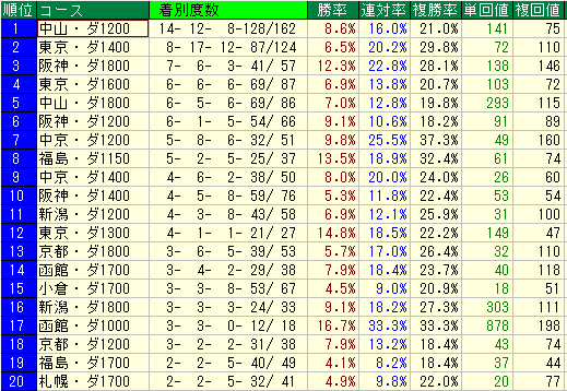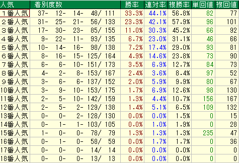• 勝率7.1%、連対率14.2%、複勝率20.4%、単勝回収値48、複勝回収値113