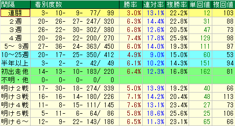 • 「4週」と「5~9週」の間隔が最も安定した好走と優秀な回収値を期待できる狙い目です。
