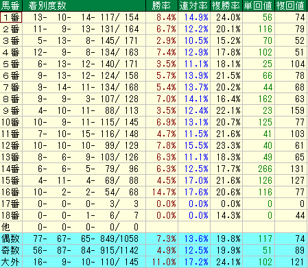 • 1番、6番、9番、11番、12番といった馬番は複勝率が良く、安定した好走が期待できます。特に9番の複勝回収値159、14番の単勝回収値266は穴狙いの大本命です。