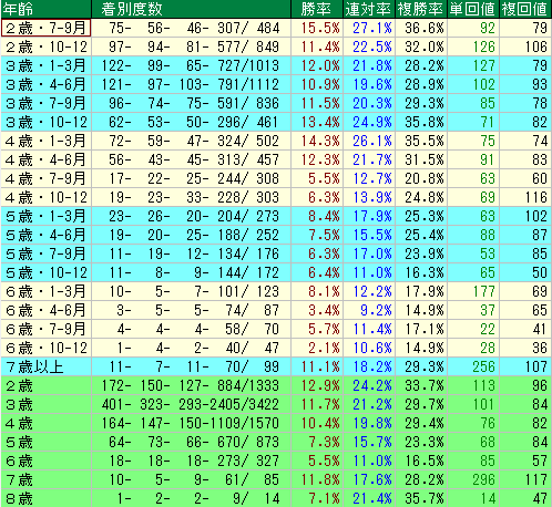 - 6歳になると、その傾向はさらに顕著になり、複勝率は**16.5%**まで落ち込みます。馬券的には非常に厳しい戦いとなります。