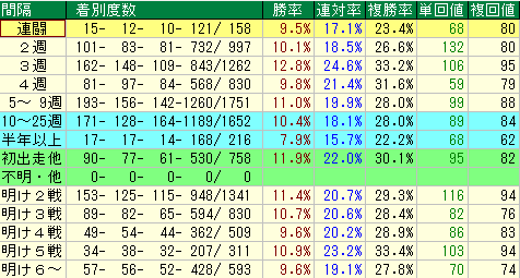 - 明け2戦目: 休み明け初戦を叩かれたこのタイミングで、早速パフォーマンスが向上します。複勝率29.3%は高いレベルであり、叩いた効果がすぐに出るタイプです。