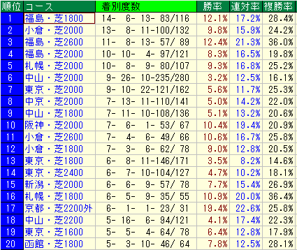 逆に、芝1300m以下の短距離戦は連対率がわずか6.5%とかなり低いです。出走数自体も少ないため、短距離芝では基本的にノーマークで問題ありません。