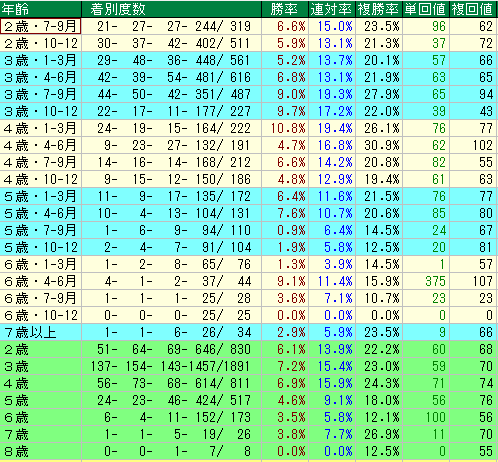 - 最も高いパフォーマンスを発揮するのは、3歳夏(7-9月)から4歳春(4-6月)にかけての「成長期」! 特に4歳・4-6月は複勝率・回収値ともに最高の狙い目と言えるでしょう。