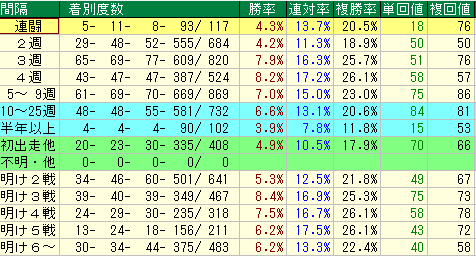 - 明け5戦 (複勝率 26.1%, 複勝回収値 72)
