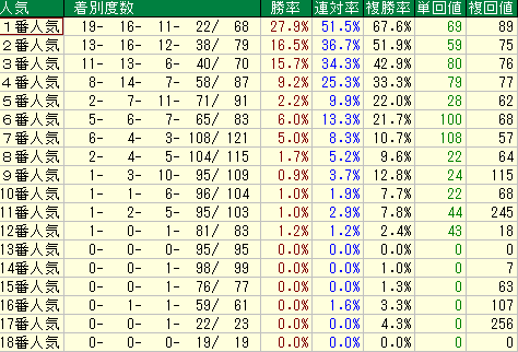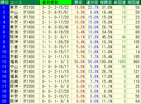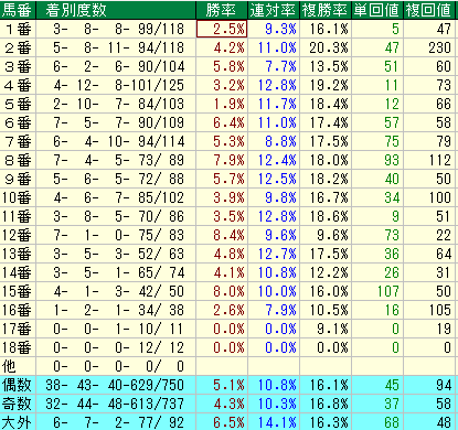 • 外番 (13~18番): 種牡馬データでは複勝率が平均より大幅に低く、特に14番以降は壊滅的なデータが見られるため、全体としては非常に苦手と言える。