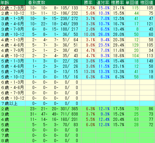 • 一方で、3歳前半~夏場や、4歳夏場、そして5歳後期は、パフォーマンスが低下し、回収率も低調な「危険な時期」と判断できます。