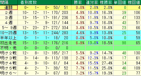 • 明け5戦 (複勝率25.0%, 複勝回収値109): 複勝率が非常に高く、複勝回収値も100を超えているため、馬券の軸として信頼できます。