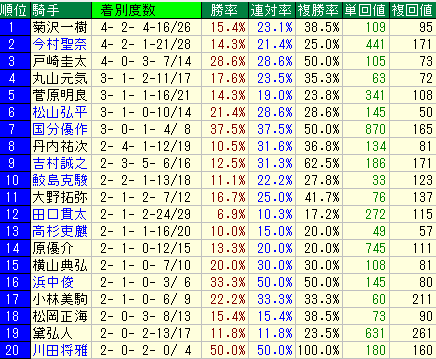 複勝回収値7229平均より大幅に低い。回収率も低い。