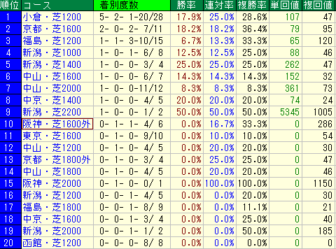 複勝率22.2%28.3%平均よりかなり高い。非常に得意。