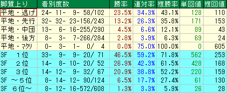 考察: 中枠(5~12番)に関しては、複勝率は平均とほぼ同じですが、単勝回収値が平均よりやや高いという特徴が見られます。特に9番 (勝率15.0%, 単勝回収値284)11番 (連対率25.0%, 複勝率28.3%)6番 (勝率11.0%, 単勝回収値166, 複勝回収値100) といった特定の馬番で好成績を収めており、中枠の中でも特に狙い目となる馬番が存在します。
