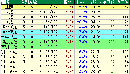• 連闘: 複勝率18.2%、単勝回収値24、複勝回収値47。