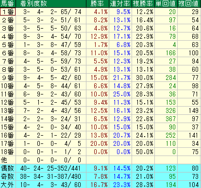 考察: 複勝率では奇数番がわずかに優勢ですが、回収率では偶数番が圧倒的に有利です。特に単勝回収値は偶数番が123と高い数値をマークしており、偶数番の馬番に入った際には、人気薄での激走に期待できるでしょう。