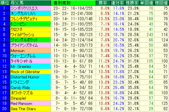 - 種牡馬データ(大外): 複勝率22.3%、単勝回収値81%、複勝回収値62%。