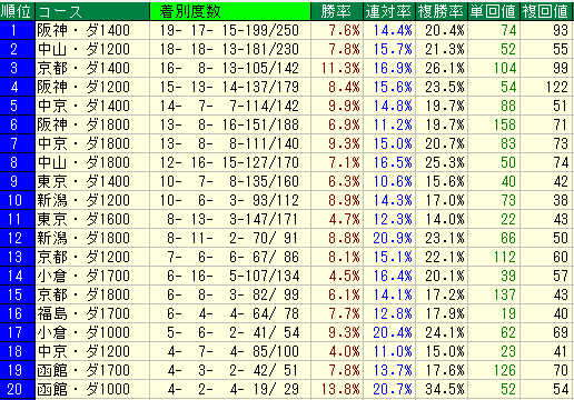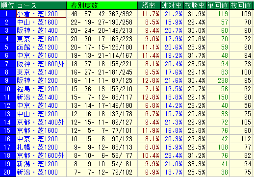 最後に、大外枠(最も外側の馬番)の得意度を見ていきましょう。
