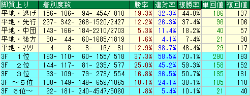 - 複勝率23.7%、回収値も平均的。好走率は維持するものの、大幅な上昇は見込めません。