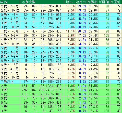 - **4歳・1-3月は複勝率29.3%**と高く、再び高い信頼度で狙える時期です。