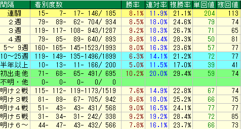 - 明け4戦目は勝率9.0%、複勝率**24.1%**と高く、回収値も平均的です。