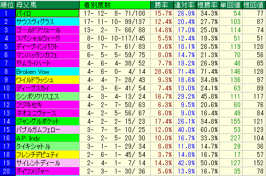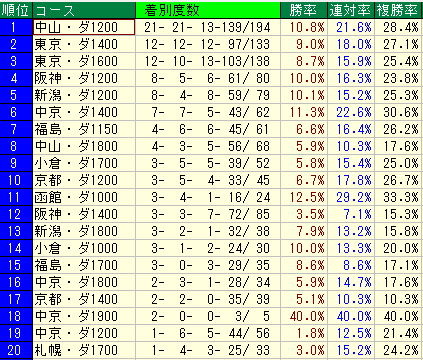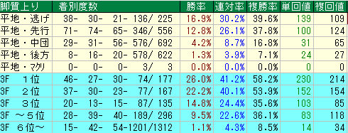 • 種牡馬データ(複勝率): 5番24.1%(平均より高い)、6番20.8%(平均より低い)、7番23.9%(平均より高い)、8番26.2%(平均より高い)、9番19.3%(平均より低い)、10番25.6%(平均より高い)、11番21.1%(平均より高い)、12番28.1%(平均より高い)