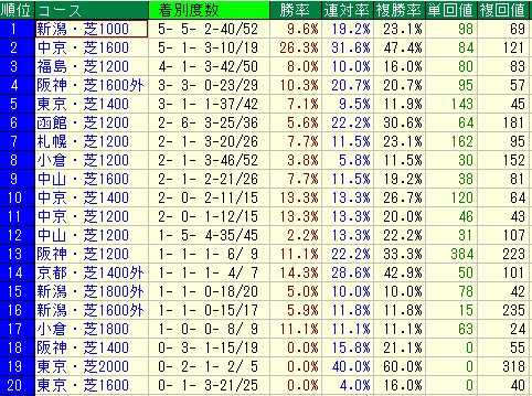 • 内枠(1~4番)は苦手な傾向にあり、特に3番、4番はパフォーマンスが落ち込みます。