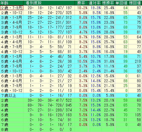 • 2歳・7-9月: 複勝率25.4%、単勝回収値64、複勝回収値87と、2歳馬としては高い複勝率を誇り、回収率も悪くありません。