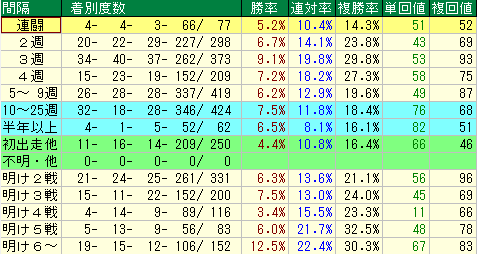 • 連闘: 複勝率14.3%、単勝回収値51、複勝回収値52と、全ての項目で低調です。