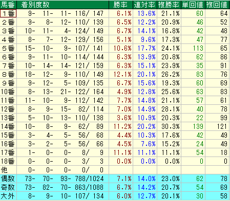 • 外枠の中でも「14番」は高複勝率を誇り、穴狙いの妙味があります。