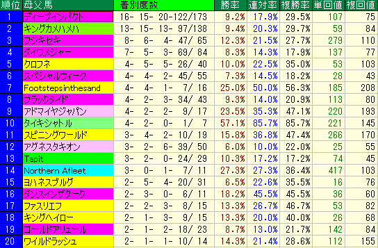 • コメント: 好走率は平均レベルですが、回収値が非常に優秀です。適度な間隔を空けることで、能力を最大限に引き出せる産駒が多いと考えられます。人気薄での激走にも期待できます。