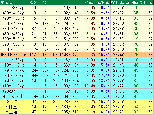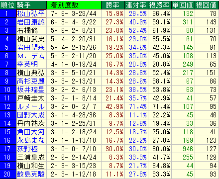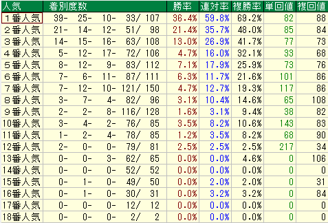 • 勝率2.7%、連対率12.2%、複勝率23.0%、単勝回収値6、複勝回収値112