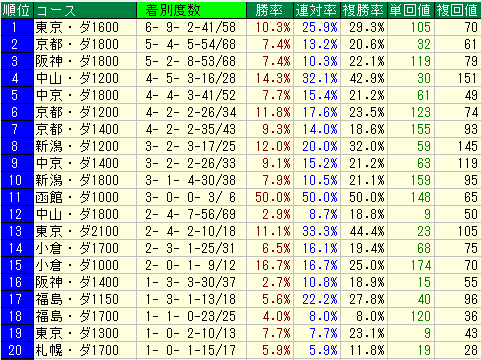 • 半年以上: 勝率4.9%、連対率9.8%、複勝率19.5%、単勝回収値336複勝回収値131