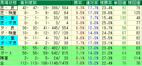 • 勝率9.4%連対率17.1%複勝率23.5%、単勝回収値95、複勝回収値66。