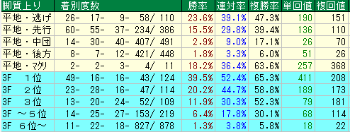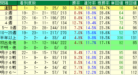 • コメント: 好走率は低いものの、単勝回収値が336、複勝回収値が131と驚異的な数字を叩き出しています。これは、長期休養明けでも人気薄で激走する大穴タイプがいることを示唆しています。一叩き必要な馬が多い中で、いきなり結果を出す馬は、能力が非常に高いか、立て直しが成功した証拠と言えるでしょう。