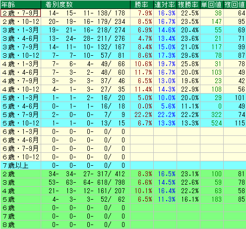 • 5歳後半(7月~12月)は好走率こそ低いものの、「単勝・複勝回収値が跳ね上がる」穴の時期! 人気薄でも一発を秘めている馬が多く、高配当を狙うならこの時期がチャンスです。