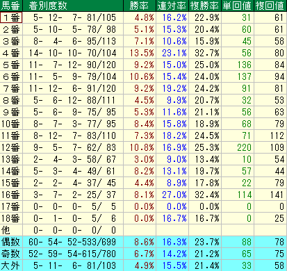 • 偶数番の方が奇数番よりも好成績! 馬券検討の際には、偶数番の馬を優先的に評価するのも良いでしょう。