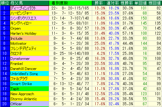 外枠(13番~18番)は、内・中枠に比べると、明らかにパフォーマンスが落ちます。複勝率が平均を上回っている枠もありますが、これはドゥラメンテ産駒全体のポテンシャルが高いためであり、この産駒の得意条件とは言えません。外枠からスムーズにレースを運ぶのが、他の枠に比べて不得手であることが分かります。
