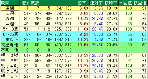 - 5~9週(単回100/複回76): 複勝率は高いレベルで安定し、かつ単勝回収率が100。妙味を求めるなら、この間隔がベストです。