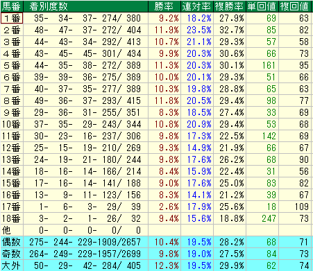 - **配当妙味を求めるなら「奇数番」**の馬の単勝やヒモ穴に妙味あり。