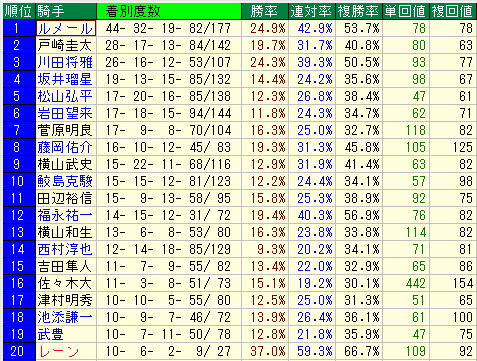 - 13番~17番は平均を上回っていますが、内・中枠ほどの信頼度はありません。